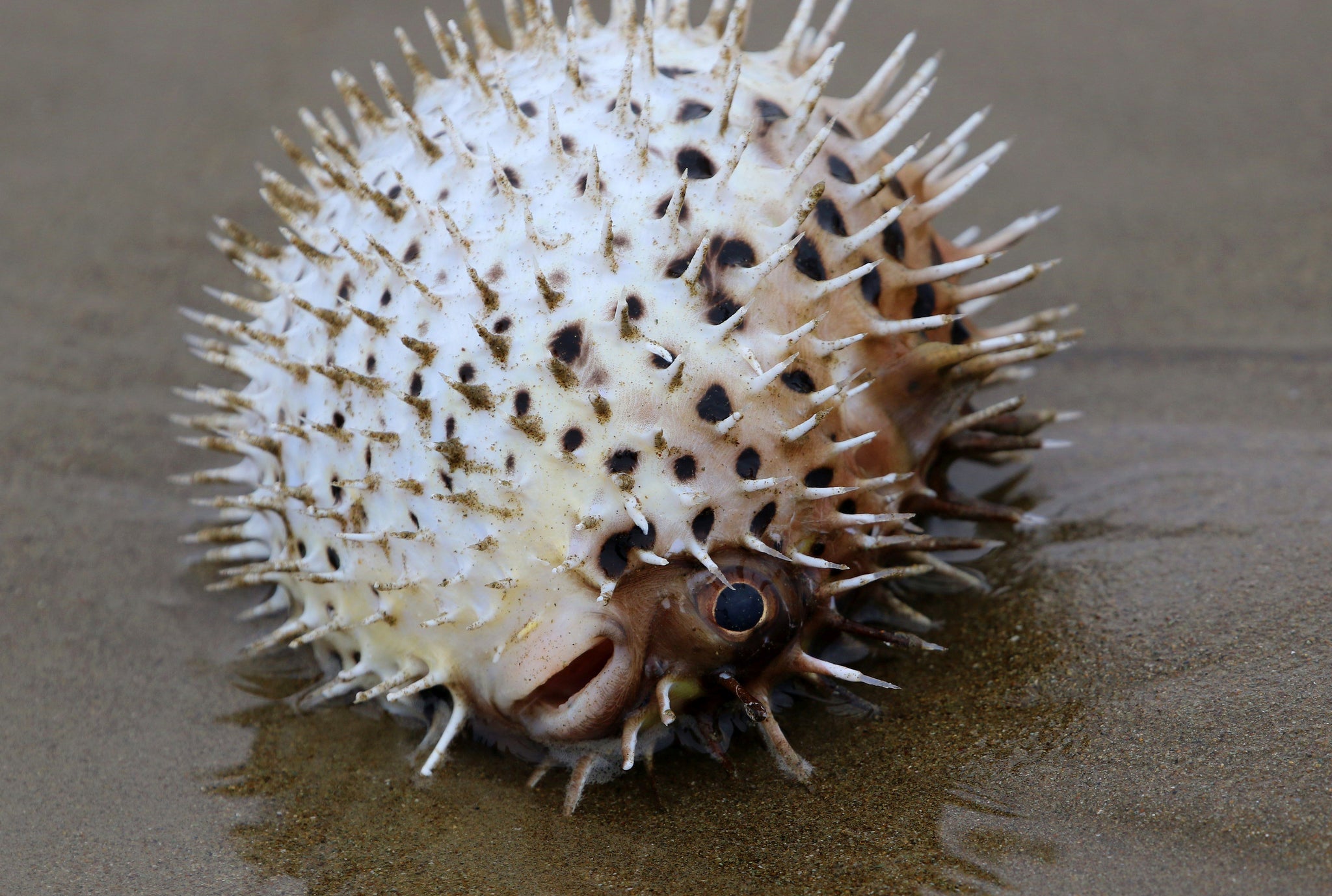 Top photo: an inflated long-spine porcupinefish washed up on the beach dead (bloated)