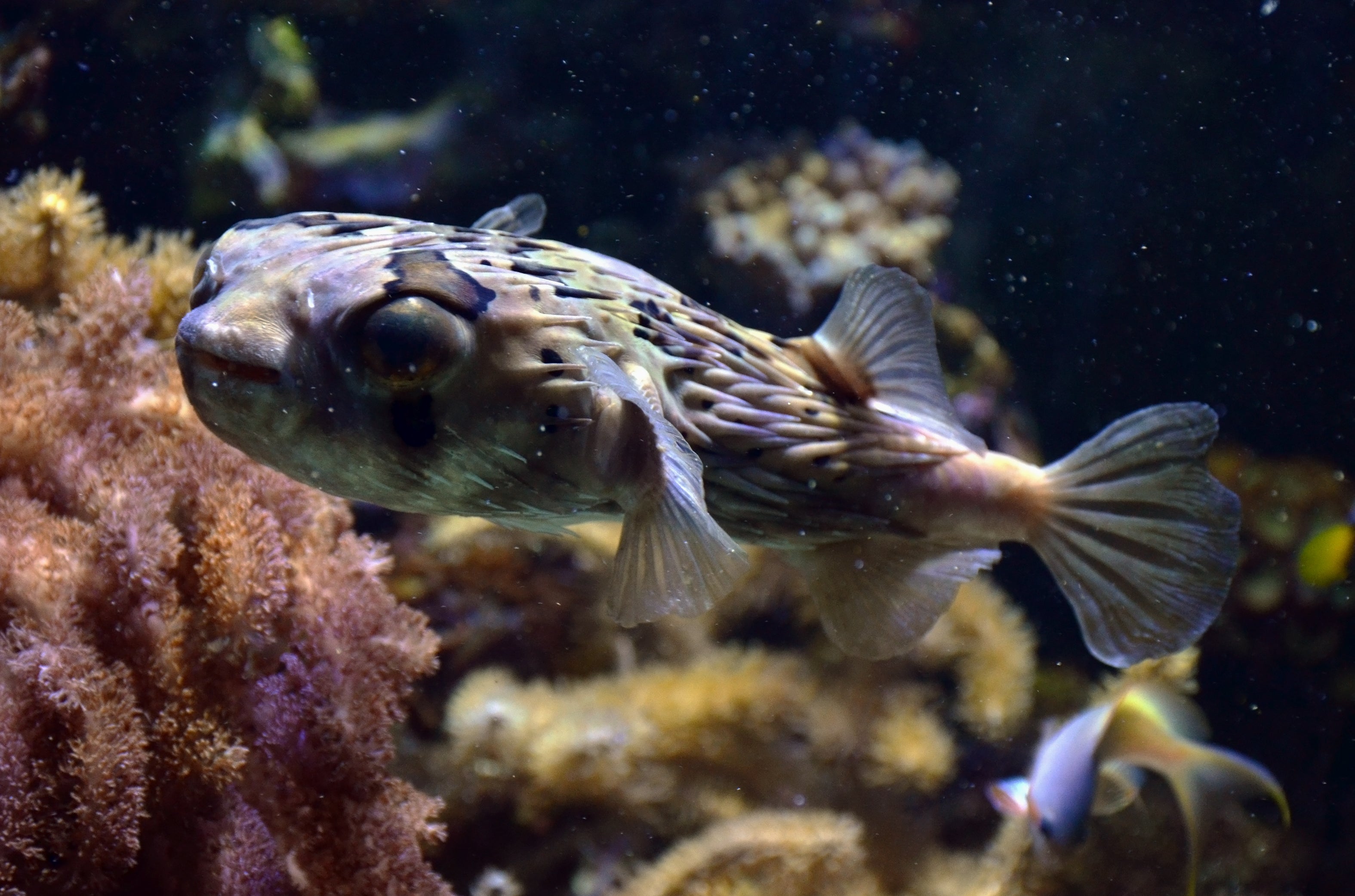 Bottom photo: a deflated long-spine porcupine fish swimming (not bloated)