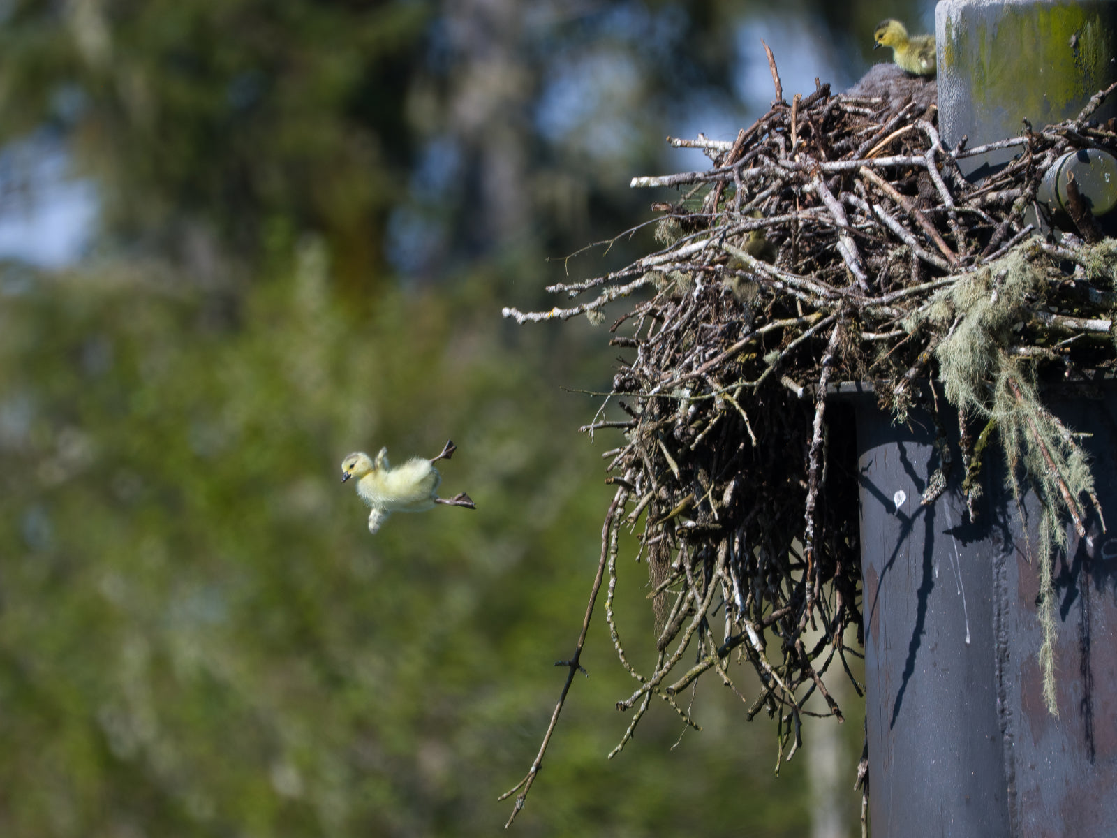 Bottom photo: a flightless gosling leaping from its nest into the Columbia River 25 feet below (courageous)