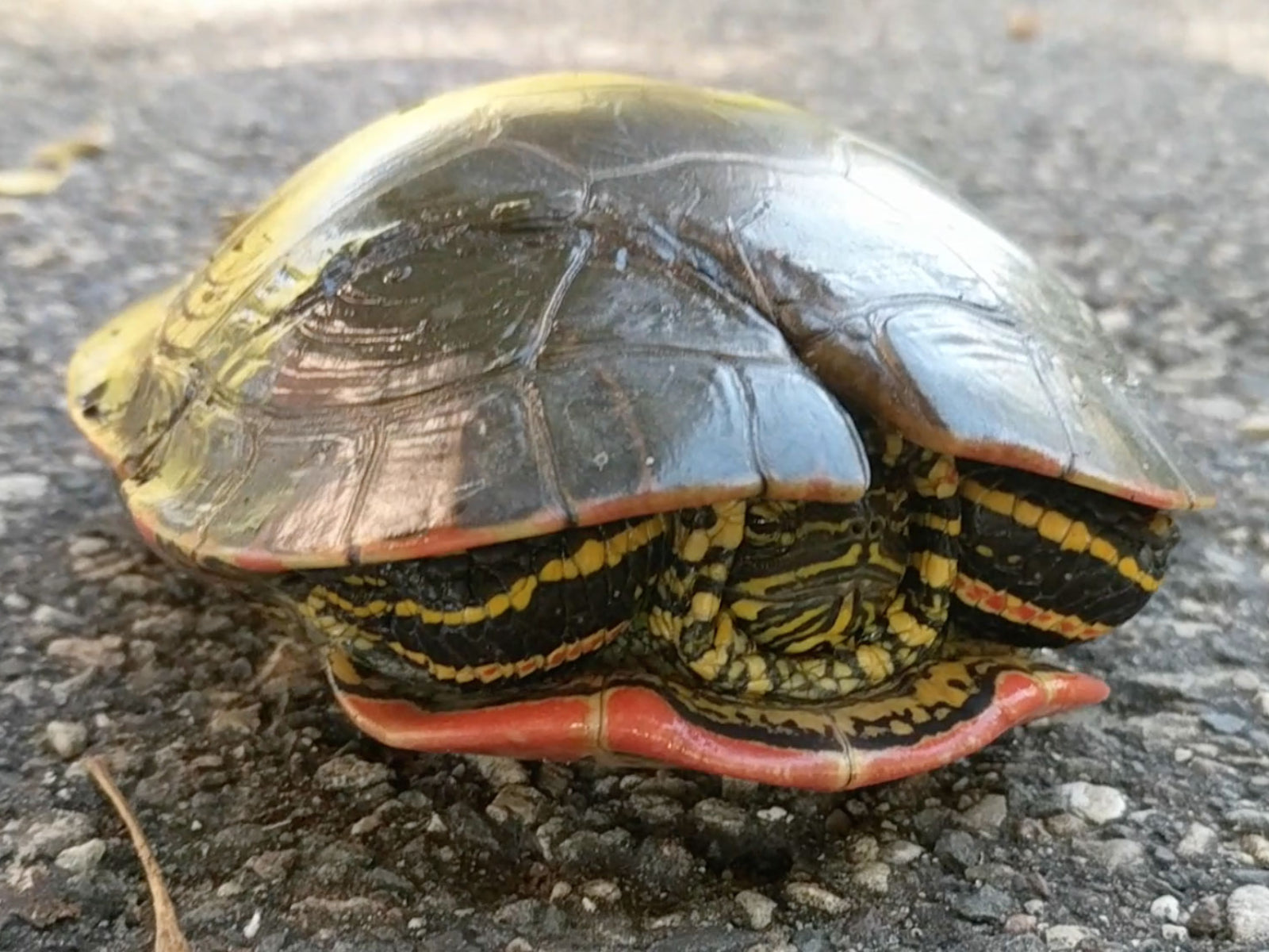 Top photo: a traumatized painted turtle with a shell that has been repaired by wildlife rehabilitators (cowardly)