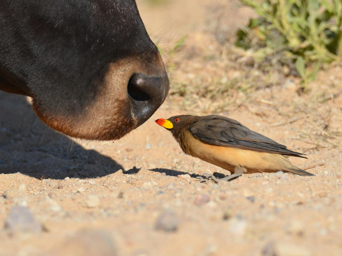 Top photo: a yellow-billed oxpecker poking its beak in someone else's business (playing hooky)