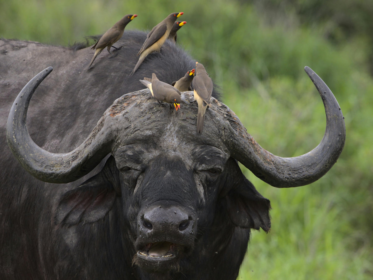 Bottom photo: yellow-billed oxpeckers on an African buffalo (at school)
