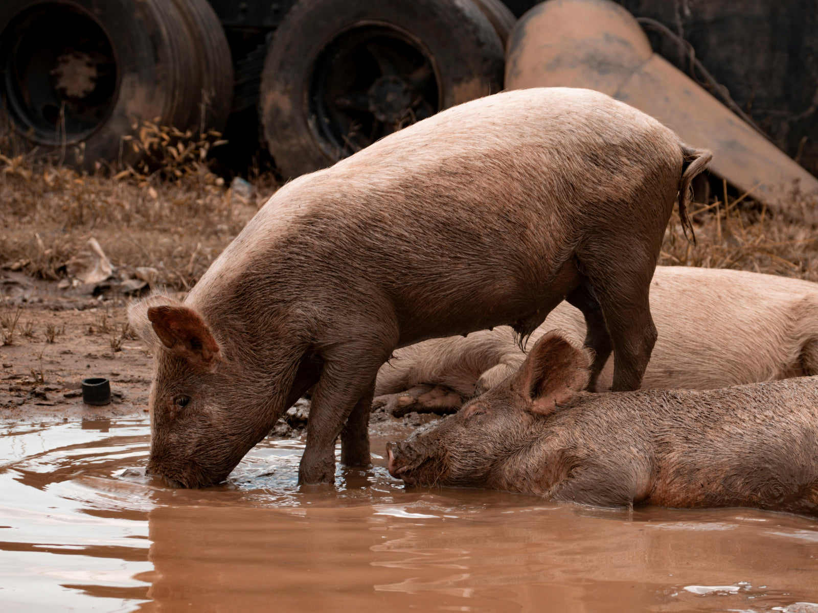 Top photo: pigs enjoying a mud puddle (poor self-care)