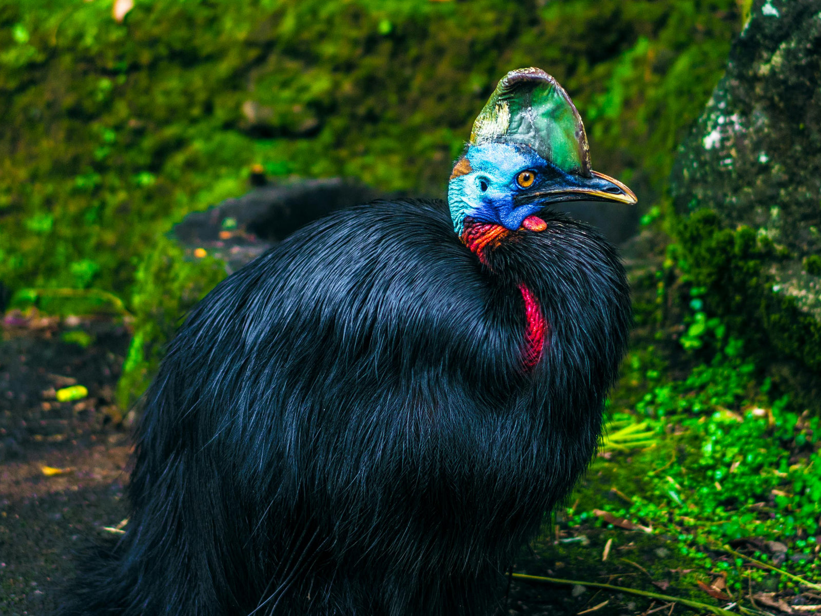 Top photo: a cassowary that retains some of the features of the dinosaurs that it evolved from (living in the past)
